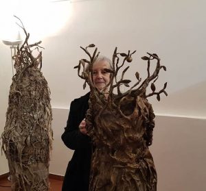 La parte bambina che è in Silvia esce anche nelle sue “Albere”, sculture che richiamano le piante del bosco. Figure dal corpo femminile, dalle teste sostituite da chiome dirami, dagli abiti tra i quali spesso si celato volti che osservano. Personaggi di una fiaba che accompagnano nel bosco dove è possibile sentire il vento,
