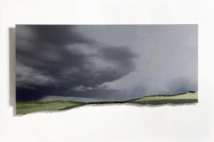 Negli anni più recenti, la ricerca di Simona Uberto si sposta progressivamente verso il paesaggio, inteso non come rappresentazione naturalistica ma come luogo mentale e percettivo. Da questo slittamento nasce la serie Fata Morgana, nucleo centrale della mostra, in cui le immagini oscillano tra realtà e illusione. Attraverso operazioni di frammentazione, ribaltamento e ricomposizione, l’artista destabilizza la percezione: cieli che diventano terre, superfici liquide che si confondono con l’orizzonte, skyline capovolti. Il paesaggio si trasforma in miraggio, mettendo in crisi le certezze visive dello spettatore.