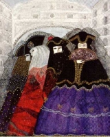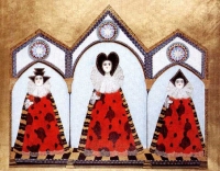 'Trittico', 1998Passando per i Boboli – E' nata a Firenze ed è lì che si animano le sue figure. Pittrice eccentrica, Simonetta Carpini crea e immagina personaggi unici; donne dalle ampie gonne, dai cappelli originali, dai mantelli variopinti. Figure scappate dai disegni di una fiaba, dal paese dei balocchi, dai teatrini di marionette. Una pittura che si avvicina al collage, al patchwork colorato delle stoffe. Un mondo fantastico si fa spazio nel mondo reale. A fatica, ma con piacere.