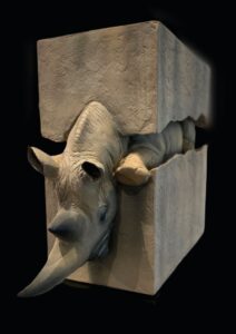Chiude il percorso Progetto: Monachesimo armato (2020), studio grafico di un’opera esposta alla 54ª Biennale di Venezia. Una grande testa di rinoceronte ospita al suo interno una biblioteca, illuminata da un fascio di luce che filtra dal corno. Un microcosmo silenzioso, dove il sapere diventa rifugio sacro e intimo.