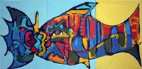 'Baciopesce', Puntapao"Il simbolo vuoto" – Ogni opera pone, quindi una domanda al suo interlocutore visivo, che è chiamato a trovare la risposta, sua e personalissima. Il simbolo vuoto vuole esprimere questo significato in formazione, in cerca di identificazione, perché riempito dell'esperienza e della conoscenza di ciascun fruitore dell'arte. Le opere di Puntopao si pongono come dei simboli 'vuoti' da riempire con la sensibilità e la profondità di chi guarda, in dialogo con ciò che ha scoperto e trasmutato in pittura l'artista. Per Puntopao, l'arte è la testimonianza diretta di un 'esserci', di un vissuto indagato e sviluppato completamente sulla tela e nella materia-colore. Il percorso della mostra è un viaggio nella gioia viscerale del dipingere. La mostra è a cura di Antonio d'Amico, critico d'arte ed è organizzata dell'Associazione Culturale Flangini di Saronno con il patrocinio del Comune di Milano e di Verona. L'inaugurazione ha dato modo ai presenti di approfondire il legame tra possibilità intrinseche dell'ispirazione artistica ed esperienza sensoriale dell'arte terapia. Una pittura, quella di Puntopao che manifesta uno stile libero da schematismi e regole, una pittura emotiva e profonda.