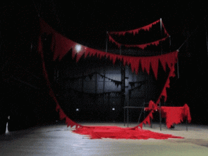 “Remains” apre il percorso espositivo con una grande installazione dove Sheela Gowda (Bhadravati, Karnataka, India, 1957) elaborando un insieme di drappi rossi di cotone grezzo compone uno scenario di decine e decine di metri che vanno dalle travi portanti del Pirelli Hangar Bicocca sino a terra, sorretti in più parti da alcuni pali di ferro.