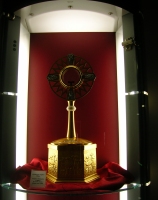 Ostensorio, Scuola Beato AngelicoA contatto con Dio – "L'iter ascetico" prosegue nell'ultima stanza, quella più in alto, dove silenziosamente, avvolti da una luce soffusa, emergono i bozzetti in legno e polistirolo di alcune sculture realizzate per il Duomo di Milano, e dove campeggiano, illuminate da una luce diretta, due tele di Pietro Albetti, nelle quali sono rappresentati alcuni particolari della Grande Fabbrica milanese, un edificio artistico che, slanciandosi verso il cielo, sembra voler legare la vita degli uomini a Dio. Un legame che però rimane privato fra artista e Dio, come specificano le parole di Eugenio Corti nel romanzo "Il cavallo rosso", quando scrive "Dovunque sulle guglie gotiche c'erano statue (…) Pensò ai maestri scalpellini che le avevano scolpite; uomini sconosciuti, i quali (…) avevano speso la vita intera, soprattutto nel Medioevo (…) a scolpire con pazienza e spesso con arte mirabile le statue delle cattedrali, anche quando sapevano che una volta issate al loro posto, nessuno avrebbe potuto ammirarle, nessuno, tranne Dio".