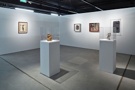A parete e in dialogo con le sculture di Fontana e Rosso una Crocefissione di Alberto Burri, combustione plastica di piccolo formato che restituisce nella sua bidimensionale trasparenza lacerata e soggetta a combustione, tutta la drammaticità dell'atto della Crocefissione. Liberare lo spazio, e allo stesso tempo di liberarsi di esso, rompendo e lacerando le forme è il messaggio forte di emancipazione di nuova possibile esistenza attraverso un passaggio di sofferenze e lacerazioni. La mostra continua al di là di ogni distinzione cronologica con i due bronzi di Marino Marini il Giocoliere del 1946 e il Prigioniero del 1943. Questi sono gli anni del rifugio in Svizzera a Locarno, e nelle opere di questo periodo l'artista ha inteso esprimere il ridicolo dell'esaltazione di un uomo che vuol comandare. L'umanità ha paura e l'artista la manifesta in opere come queste, dove la materia va a rompere le proporzioni e a prendere campo, infliggendo alle forme una tensione inaspettata. Il Prigioniero malinconica e struggente scultura in bronzo, testimone di efferati e disumani avvenimenti in territorio europeo ci disorienta e quasi mette in imbarazzo ancora oggi pensando alla data, quel 1943 quando l'umanità intera finalmente prende coscienza dell'ancora oggi, per alcuni aspetti, inspiegabile atto di depravazione umana che furono i campi di sterminio nazisti e gli orrori della guerra tutta. Anche il Giocoliere del 1946 porta ancora il peso di quegli anni bui, e nella sensibilità esperita della forma appare il senso del tragico che si manifesta in una figura echeggiante i lacerati corpi dei cristi crocifissi di gusto tardomedievale. Marino stesso definisce le opere di questo periodo architetture di un'enorme tragedia. Accomunate da titoli sintetici e descrittivi, queste sculture incarnano, nella particolare postura e inclinazione delle membra o del volto, una sintesi di appartenenza e di estraneità al mondo, di vitalità e spiritualità; sembrano suggerire che la vicenda di Cristo tra gli uomini fino al sacrificio della Croce possa essere celebrata da "piccoli ebrei", "giocolieri", "prigionieri", ovvero da coloro che appartengono al mondo degli umili e dei sofferenti.