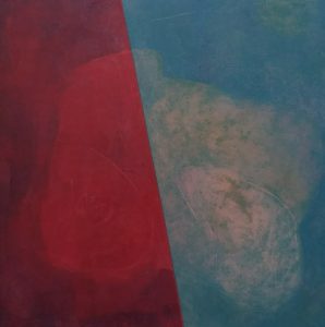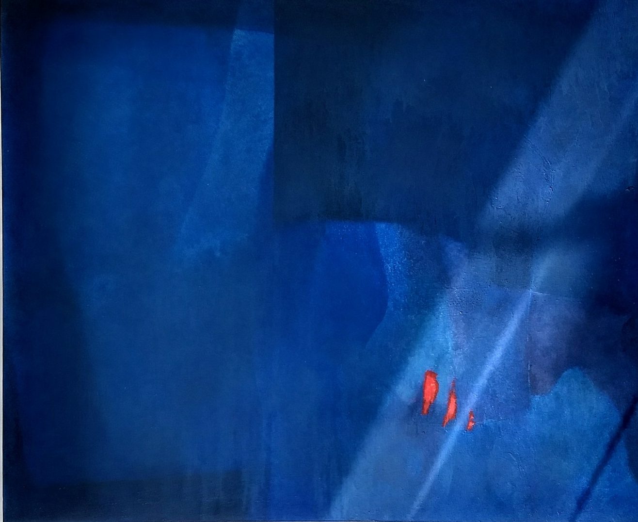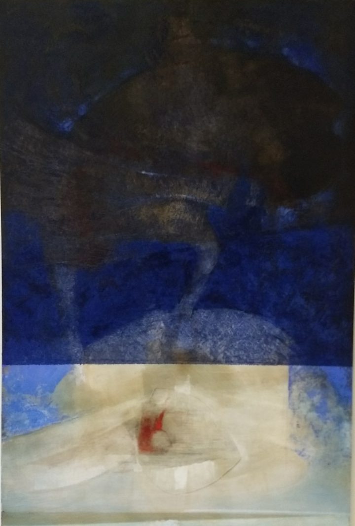 Un racconto silenzioso quello di Vanetti, dove mette a nudo la sua anima attraverso l’esplorazione di nuove cromie. I neri densi , ora diventano lievi e accarezzano i blu. Blu come i cieli i mari, dentro cui perdersi, abbandonarsi e lasciarsi trasportare liberandosi da vincoli e prigionie di pensieri. Ma ecco che le memoria si riaccende nei rossi, dalle sfumature più sgargianti a quelle più timide. Guizzi incandescenti, che
