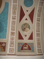 Partic. dell'internodal borgo. L' interno presenta un apparato decorativo molto rimaneggiato nel tempo per i restauri che si sono succeduti, ma alcuni motivi, per la loro peculiarità, è possibile siano stati riproposti in base ad una memoria sedimentata e risalente sempre all'epoca longobarda. Ampi spazi sono decorati con motivi a nastro secondo il gusto orafo del popolo longobardo. La presenza di croci dipinte dalla forma celtica e lobata fanno pensare ad un'epoca anteriore al Mille, alla quale invece appartengono iconograficamente le croci dipinte con doppio braccio, legate alla storia dei cavalieri Templari.