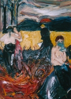 Sul set della vita – Donne con grandi cappelli, chiome mosse dal vento, abiti leggeri e leggiadri. "Uno stile sofisticato e infantile che confonde sogno e realtà in composizioni colorate", dichiara l'artista, che continua, "la mia pittura, tra carne e spirito, sempre, tra ironia e dramma, talvolta". Perchè ci sono moltissime emozioni diverse nei quadri di Gaia, dalle risate con le amiche di sempre, al momento dolce di un bacio, al diretto contatto con la natura intorno a noi. "Immagini oniriche di giovani donne e giovani uomini che si osservano, si seducono, si posseggono", conferma l'artista. Non mancano situazioni passionali, come il ballo sensuale per eccellenza, il Tango. 'Racconto di donna', tra parole che si colorano di forti, decise, violente tinte, che si stagliano a tratti corposi sulla tela. Figure in paesaggi non del tutto delineati, orizzonti indefiniti, lontani, lasciati all'immaginario dello spettatore. "La mia arte evoca sensazioni di libertà e forza, sensualità e malinconia", del mondo, delle donne.