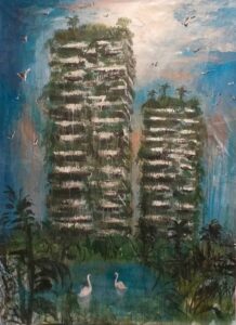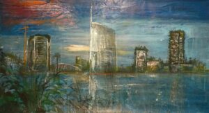 Giovanni Cerri, rivisita il paesaggio urbano – sia quello riferito ad architetture di carattere storico, sia quello periferico, più “anonimo” – con l’aggiunta della tematica urgente e “mondiale” dell’emergenza climatica. Luoghi che ci appaiono sotto una nuova luce, inquietante nella sua caratterizzazione di un ambiente post-umano, una visione drammatica del paesaggio del futuro, tuttavia molto prevedibile sulla base di ciò che sta accadendo al nostro pianeta per mano dell’uomo. In queste sue nuove opere le tendenze del presente sono percepite dall’artista come altamente negative: le tinte desolate e le pennellate che lasciano colare il colore sulla tela sono gli “avvertimenti” pittorici di quello che il cambiamento climatico sta producendo sotto gli occhi di tutti noi.