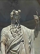 Il monumentale fondale, estraneo alla fabbrica seicentesca, poggia su un alto basamento; quattro alte colonne scandiscono la parte centrale del rospetto neoclassico, inquadrando due nicchie laterali, vuote, e una più grande nicchia entrale che ospita la statua scolpita nel 1831 da Gaetano Monti di Ravenna, unica a essere realizzata delle nove previste…