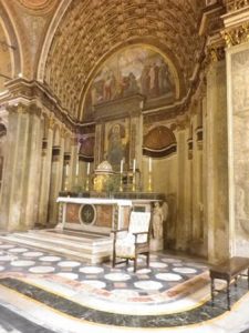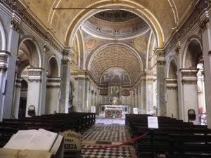 Al sorgere della navata centrale si innalza maestosa la cupola, riccamente ornata da cassettoni in armonica cadenza circolare sino all’apertura della lanterna.