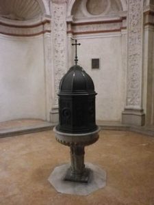 La soavità del battistero, concepito in forma ottagonale, pone al centro l’armoniosità della cinquecentesca fonte battesimale.
