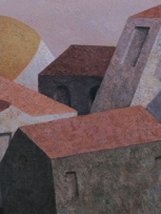 E poi c'è il mondo di Matthias Brandes (1950), un mondo scabro, dall'apparenza immobile e pietrosa, costruito a olio e tempera su tela. Lì, tra quelle case assiepate, tra quegli alberi compatti come monoliti, l'ordine e il caos si alternano, si contraddicono, giocati nel contrappunto tra il rigore delle geometrie e dei volumi giotteschi e la follia della costruzione e della scansione spaziale. Un contrappunto dagli equilibri unici, dalle perfette armonie.