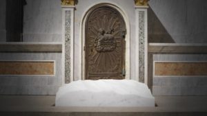 sagrestia con una installazione strutturata da sequenze di teschi realizzati con farine e mangimi aviari correlata da un video che documenta la prima collocazione in una foresta finlandese dove i manufatti divenivano cibo per le specie animali.