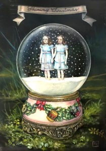 Tra gli artisti, Veronica Chessa, che ha realizzato la Boule de Neige “Shining Christmas”. – “Riflettendo sul tema di un Natale insolito, ho immaginato le terrificanti gemelline di Shining all’interno di una rassicurante palla di neve natalizia. Volevo una rappresentazione che giocasse sulla contrapposizione tra ciò che ci dà conforto e ciò che ci fa più paura, anche i contrasti cromatici che ho utilizzato lo dimostrano. Infatti il soggetto natalizio emerge da un ambiente molto cupo, ma illuminato da brillanti fili d’erba che evidenziano il bagliore della palla, mentre le innocenti bambine, intrappolate per l’eternità tra le mura anguste dell’Hotel, sono protagoniste dell’innocuo soprammobile dal piedistallo rosa pastello. Il titolo è venuto da sé: SHINING CHRISTMAS, un ironico augurio per un Natale “splendente”. L’artista Marchigiana presenta anche #Marilynoska, inedita e natalizia versione Matrioska di Marylin Monroe, nell’anniversario del 60° anno dalla scomparsa.