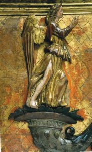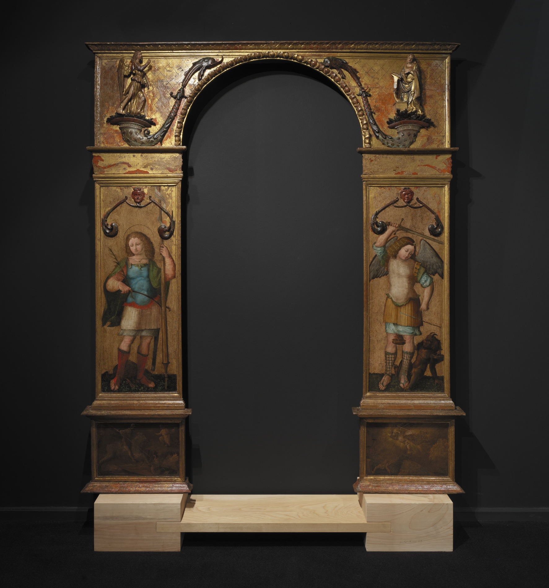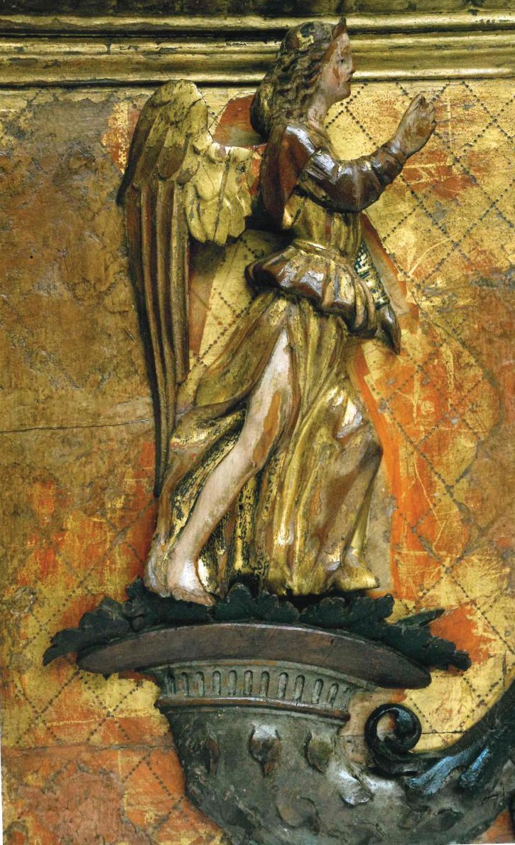 La struttura di questa cornice lignea è composta da due lesene dipinte e dorate, formata ognuna da una tavola lignea legata a un archivolto. Sui pilastri sono dipinti, a sinistra san Giorgio e il drago e a destra san Michele che sconfigge Satana. Nell’archivolto, su un fondo dorato, lavorato con il bulino a rombi, sopra due cornucopie, che nascondono due code di due delfini, sono poste le figure scolpite e dipinte di un Angelo Annunciante e di una Vergine annunciata.