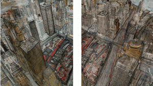 Le opere di Pietro Dente rivelano città internazionali con visioni “a volo d’uccello”. L’artista da sempre è affascinato dai panorami urbani delle grandi metropoli, che trasfigura in territori dell’immaginazione. I suoi lavori pittorici, su tela e plexiglas o plastica, sono cromaticamente complesse, e sfruttano le trasparenze, i giochi di luce e la percezione che i materiali sollecitano. “Paesaggi urbani”, magici e irreali, caratterizzati da un senso di leggerezza, di trasparenza , dell’evanescenza di facciate dietro le quali si può immaginare una vita reale.
