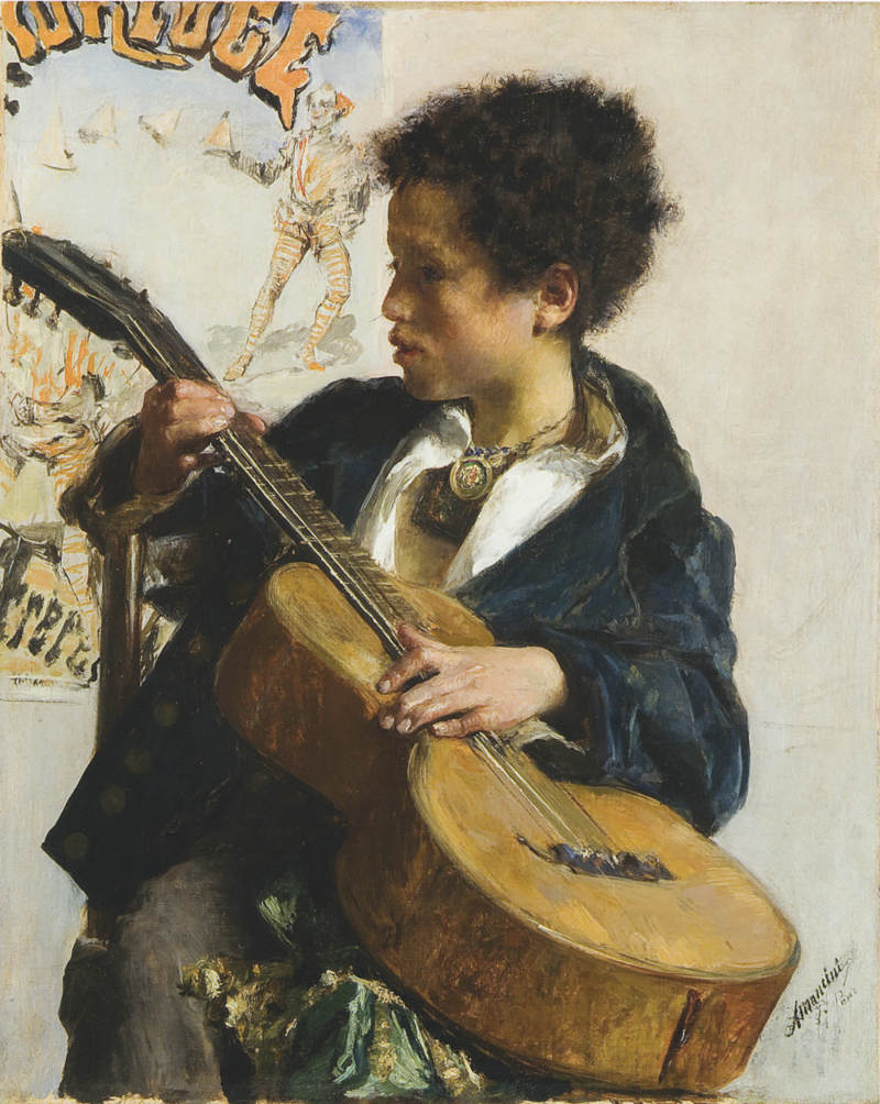 Girando di sala in sala vengono incontro altri artisti partecipi all’appuntamento con la Ville Lumière ed è un piacere fermarsi davanti alle non poche tele di Antonio Mancini che dalla città vesuviana, qui allievo di Domenico Morelli e, soprattutto, amico di Vincenzo Gemito, portò a Parigi, dove soggiornò più volte, e anche a Londra, a quei dì altra capitale dell’arte, l’intenso verismo dei suoi scugnizzi (nella foto, Antonio Mancini, Suonatore di chitarra) e delle sue orfanelle esaltato dallo straordinario valore espressivo della stesura pittorica e del colore. E poi Vittorio Corcos, anch’egli al servizio del potentissimo Goupil: all’artista livornese bastava essere nel giro di questa Maison e Salons o altre importanti rassegne potevano passare proprio in secondo piano. La sfilata delle sue jeunes femmes degli anni Ottanta dell’Ottocento, inappuntabili nelle toilettes à la page, diventa preludio ai grandi ritratti d’inizio Novecento: merita una lunga sosta quello di Lina Cavalieri, bellissima, fascinosissima, elegantissima, d’alabastro la carnagione, insomma una perfetta grande dame più che il soprano che sapeva incantare con la sua vocetta principi di Russia e miliardari americani in un vezzoso, scintillante girare di perle.