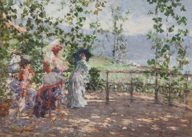 Il Verbano che si apriva alla villeggiatura borghese diventò un soggetto caro e ripetuto e al castello di Novara una sala è tutta dedicata a Leonardo Bazzaro, il maestro del naturalismo lombardo che aveva villa, diventata ritrovo per artisti e intellettuali, all’Alpino sopra Stresa, poco discosta da quella di Toscanini. Un luogo “di meravigliosa giocondità di vedute” annotavano le guide turistiche, ideale anche per ritrarre la moglie Corona nata contessa Douglas Scotti e le sue svagate amiche in leggere, candide vesti mentre “fra i tronchi diritti scintilla lo specchio del Lago turchino” come poetava Gozzano.