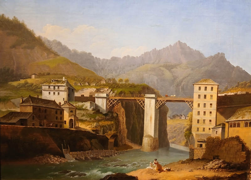 Dà l’avvio una versione in formato ridotto – quella “ufficiale” è a Brera – del Ponte di Crevola sulla strada del Sempione, circa 1821, dipinta dal bergamasco Marco Gozzi, pittore sotto contratto del Regio Governo Austriaco per riprendere i “migliori punti che offrono la Lombardia e i suoi dintorni”, non però quelli più ameni, ma dove l’opera dell’uomo era intervenuta a migliorarla, evidenziandone il suo progresso sociale ed economico. Una visione questa della pittura topografica di lucida e analitica riconoscibilità, già contraddetta nella seconda sala dove s’impone la grande tela del tedesco Julius Lange raffigurante un Paesaggio nordico con montagne che vorrebbe possedere ancora i brividi del romanticismo ma, dipinta nel 1852, è solo al limite dell’anacronismo. Di emozioni meno profonde ma volte a una pittura nuova i nostri Piccio e Fontanesi che sceglievano non solo corottiane dissolvenze su fiumi e ruscelli con verdi umidi e intrisi di luce, di acqua e di natura. Non furono pochi a scegliere con loro questa pittura d’atmosfera e in mostra lo esemplano convincentemente il portoghese, ma ligure d’adozione, Alfredo De Andrade e i genovesi Ernesto Rayper e Tammar Luxoro che con la sua Via ferrata esalta sì il progresso, ma “con juicio” e lascia padrona la natura nel suo vasto e palpitante respiro.
