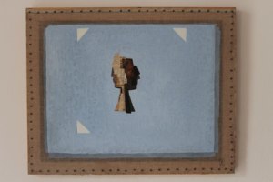 Sfumature grigie e azzurre paiono fluttuare sulla superficie creando profondità irraggiungibili da sguardi e pensieri mentre la presenza di frammenti di cornici e dipinti antichi alimentano il mistero creativo su tele interinali percorse da chiodi a segnarne il perimetro come un laico rosario.