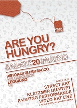 "Una serata di arte immersa in un'atmosfera tranquilla, dal titolo Are you hungry? per indicare la fame di arte che ci divora. Inizio previsto intorno alle 18.30 con esposizione di quadri (la street art di Mattia Molinari e le opere astratte di Riccardo Rudi) e sculture (ospite un'opera di Lorenzo Schievenin Boff). Poi aperitivo e cena, anche il catering rigorosamente organizzato da noi. Dalle 22 performance di live painting di Luca Dellantonio e Mattia Molinari e video arte interattiva di Riccardo Rudi. Conclusione della serata con dj set stile lounge".