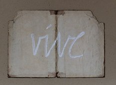 Nel '72 compare nei suoi lavori il segno pittorico "Vive" che diventerà elemento-simbolo per eccellenza; nella realtà indicazione tecnica in tipografia per salvare una parte di testo da non cancellare.